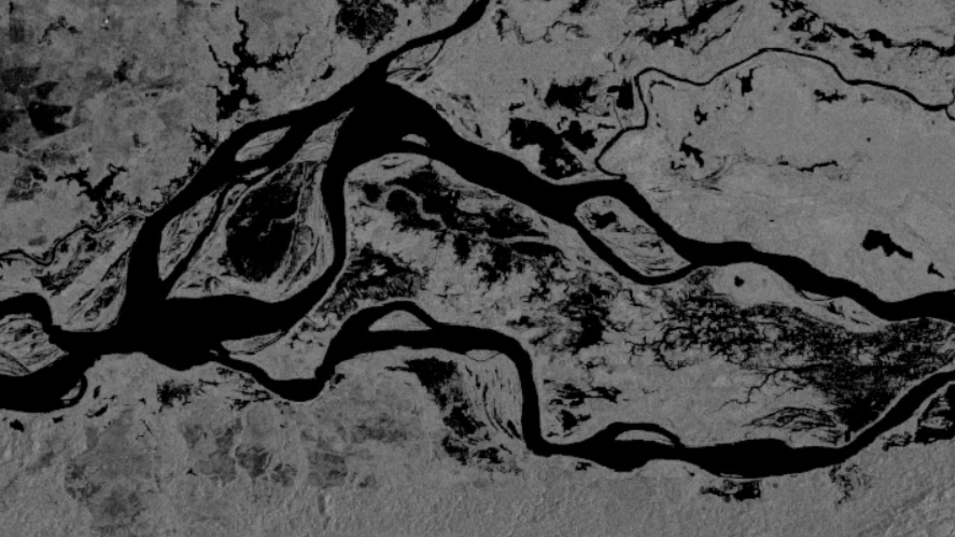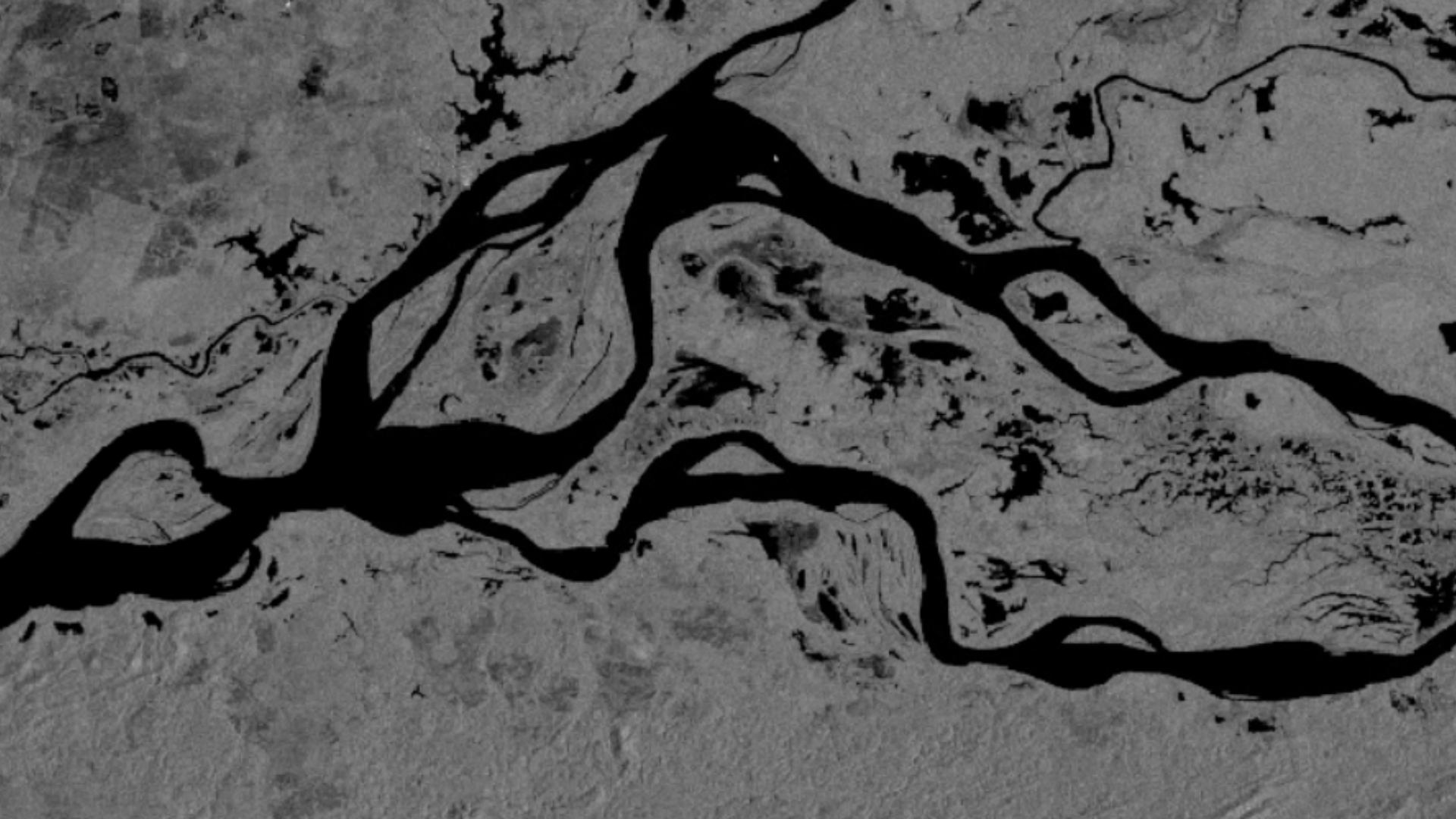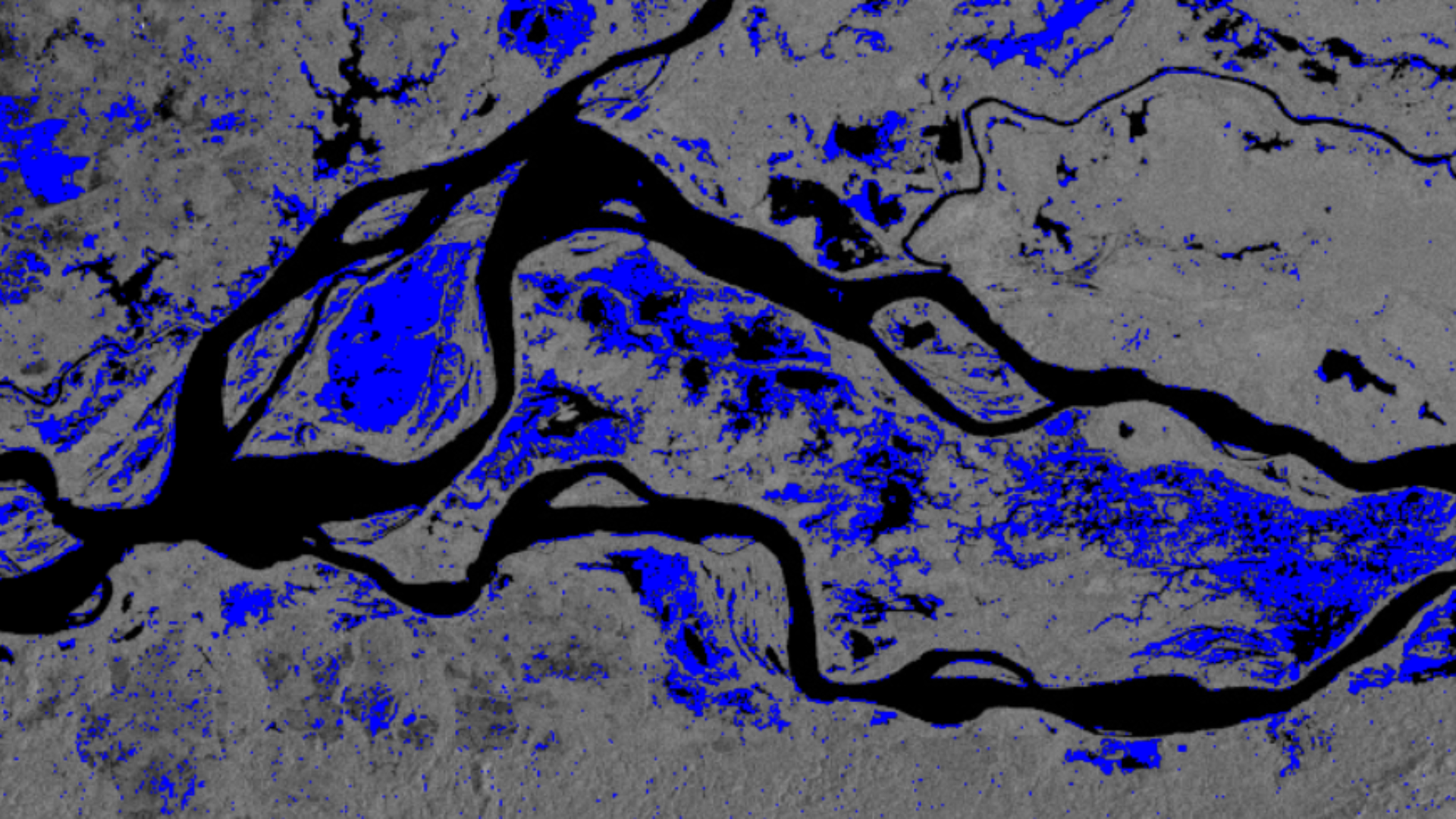 Open-source SAR imagery from Sentinel-1 was used to determine seasonal flood extent in an area of South America. For this project we performed change detection to highlight areas of new water in blue.