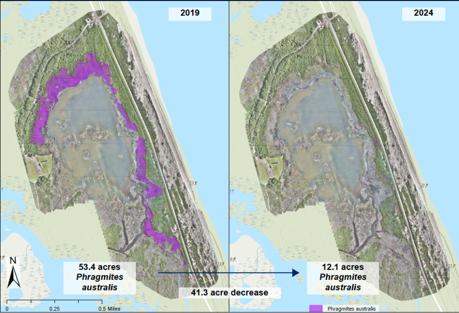 Change detection analysis quantified overall reduction or change in P. australis since mitigation began