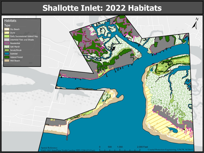 Determine habitat change following the construction of a terminal groin in Shallotte Inlet