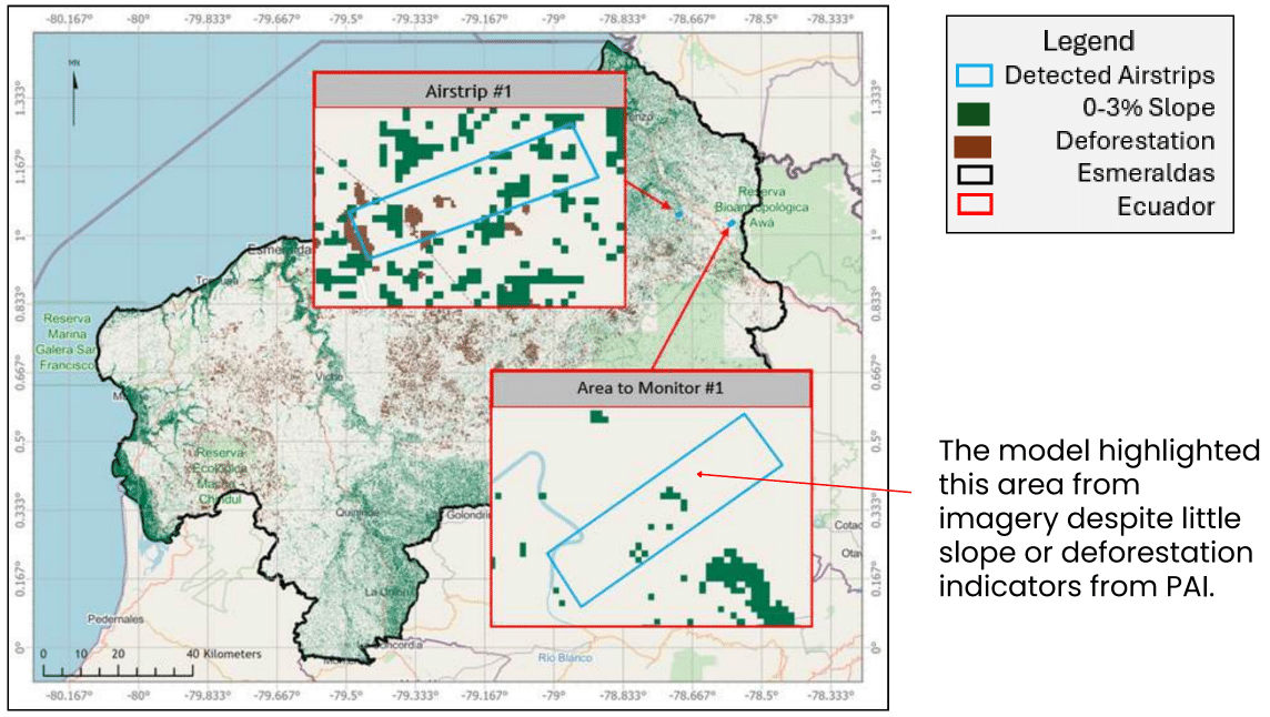 Detect illicit runways within Ecuador that meet suitability criteria for low slope, presence of deforestation, remoteness, and proximity to travel corridors including roads and waterways.